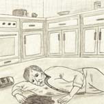 In a puddle of vomit and blood